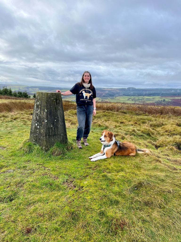 Jen with Morys the Welsh Sheepdog at trig point number 57 of 2022.